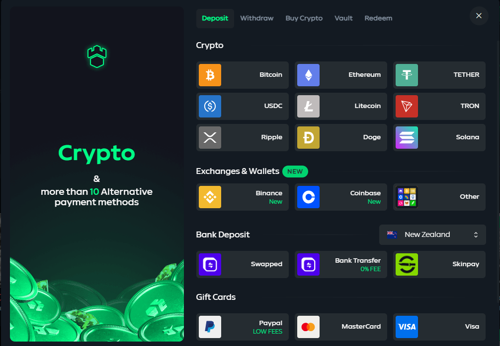 New Zealand players can also use SkinPay and Swapped (even bank transfers) to fund their betting accounts. Likewise, cards and e-wallets are available to NZ players.